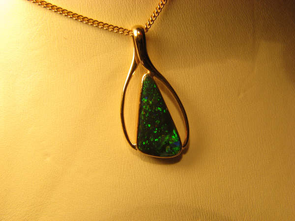 The bright and light green and gold colours of the opal are enhanced by the soft touches of blue and purple. It is a stunning piece of jewellery and we are proud to be able to offer it to you. This item is pretty well irreplaceable.