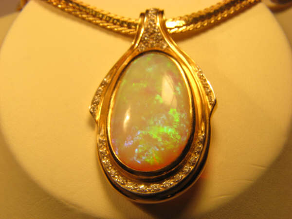 Crystal Opal of outstanding size and quality in 18k and Diamonds as Brooch and Pendant. This stunning Crystal Opal has even better colour on the rear side than the face. Herman is really mad at the Master Goldsmith for having set the Opal in reverse. "Failure to communicate".